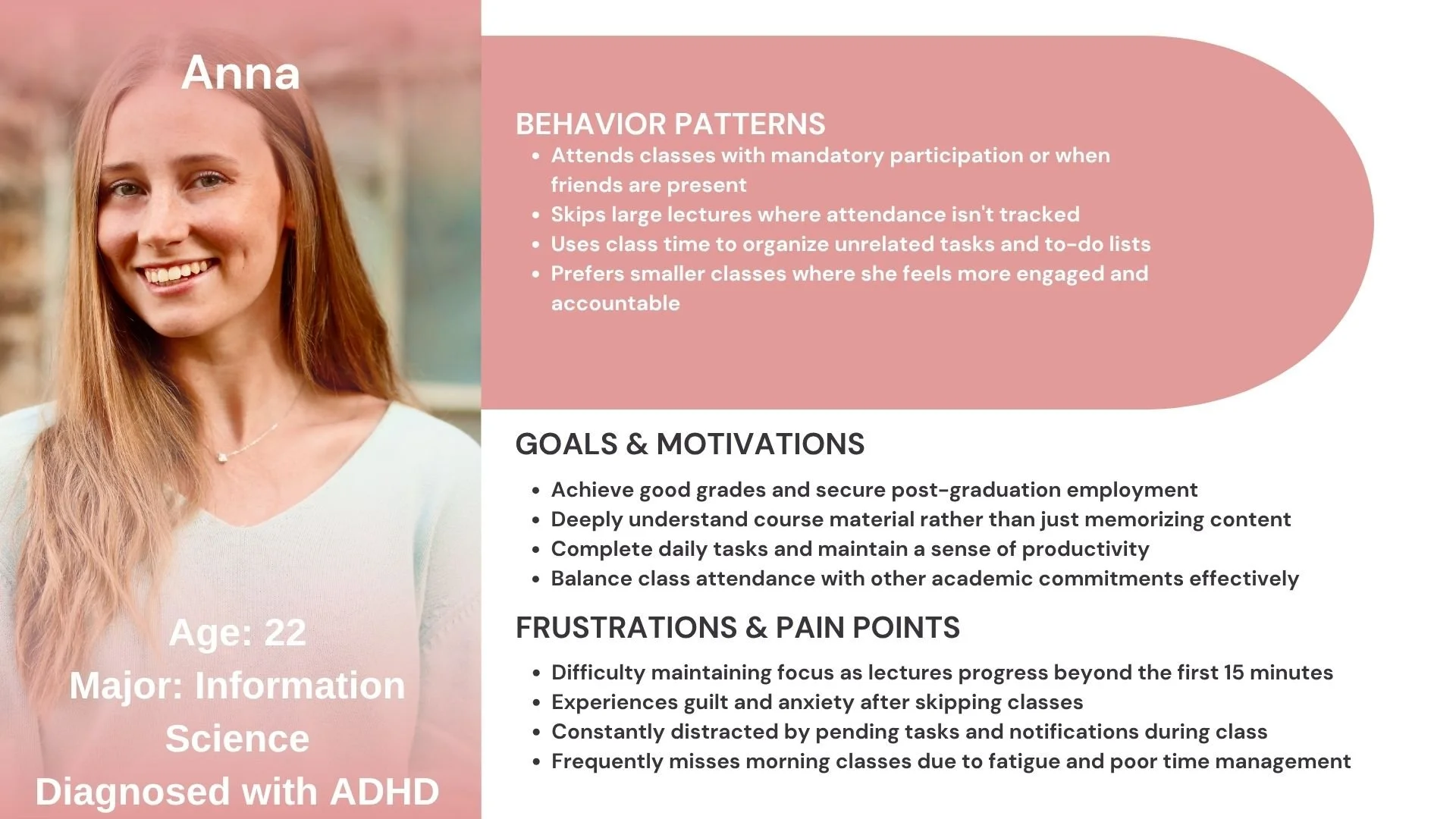 Based on contextual interviews with students with ADHD, we identified that class attendance is primarily driven by grading policies and social accountability, while in-class focus is frequently disrupted by digital and environmental distractions. These insights directly shaped our persona and informed BrainBud's design as a focus-support tool.